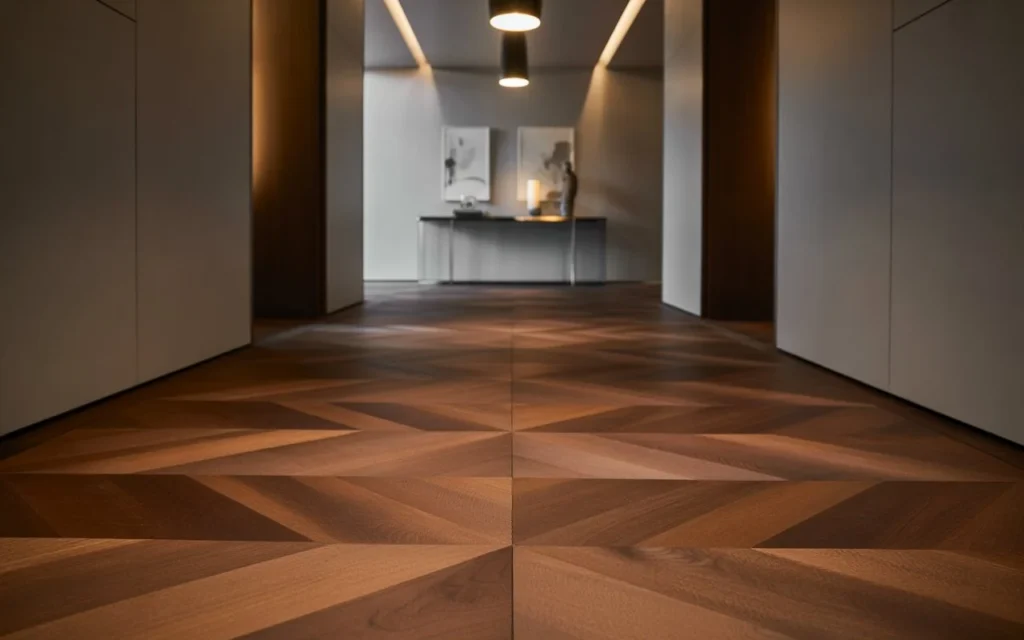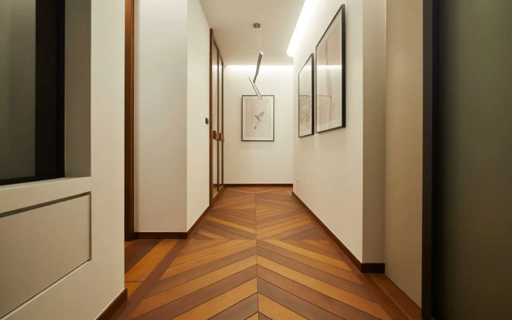 Chevron flooring is similar to herringbone but offers a more continuous, flowing pattern. This creates a sense of direction and movement, guiding the eye smoothly through the hallway.