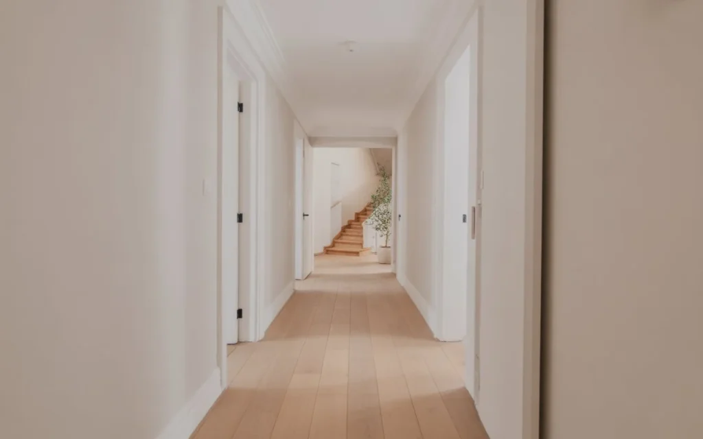 Narrow hallways can quickly feel cluttered if there are too many visual lines. Wide plank wood flooring reduces the number of seams, creating a cleaner and more open look.