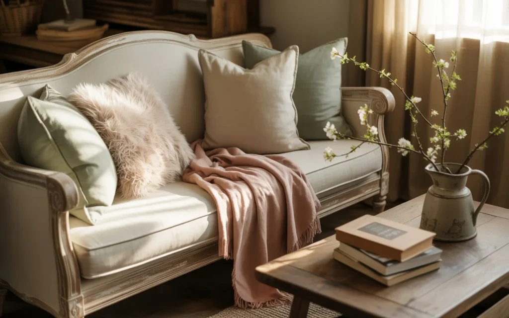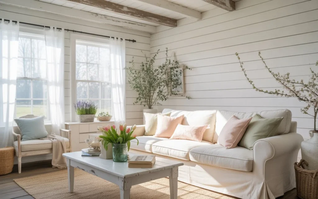 If your space feels dark or visually overwhelming, switching to a lighter color palette can make a dramatic difference. Replace heavy winter tones with soft textiles, cushions, and decor pieces in airy shades. This is one of the most effective light and airy farmhouse spring decor ideas for creating a fresh and inviting environment.