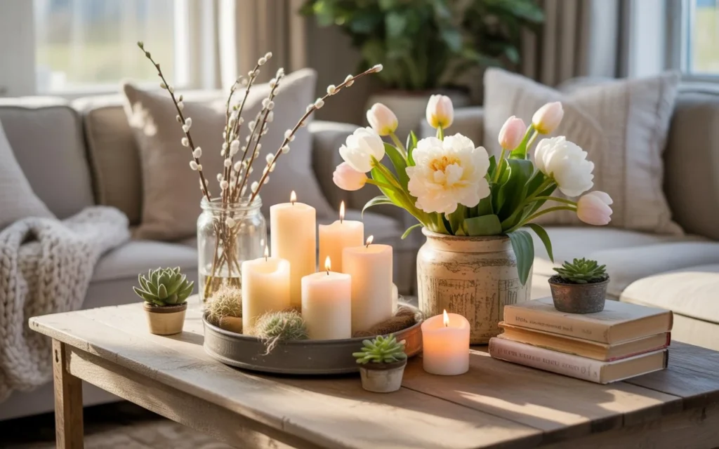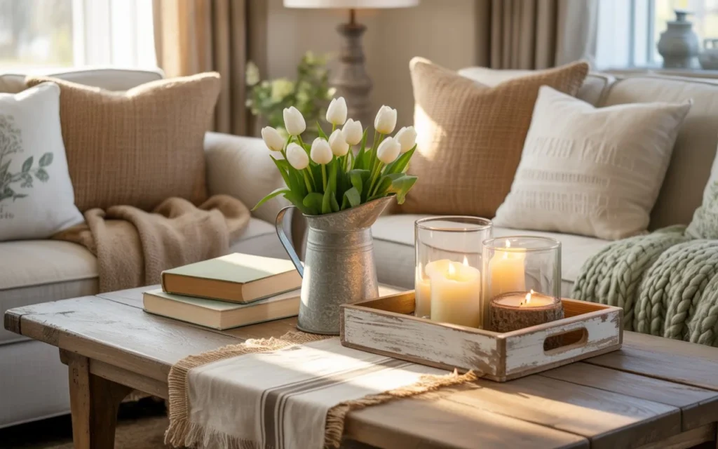 Stick to a simple color palette and avoid overcrowding the space. This helps maintain the light and airy feel while still adding personality. It’s one of the easiest farmhouse spring coffee table decor ideas to implement.