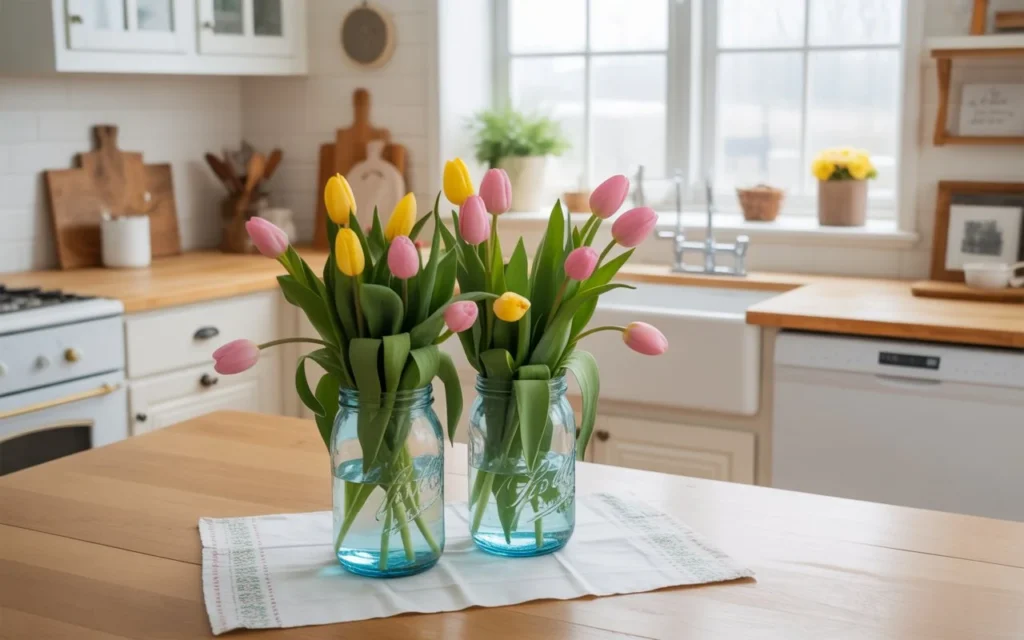 Place them in simple vases, mason jars, or pitchers for that classic farmhouse touch. This not only adds color but also creates a natural focal point in your room. It’s a must-try for anyone looking for farmhouse spring floral decor ideas that feel effortless and elegant.