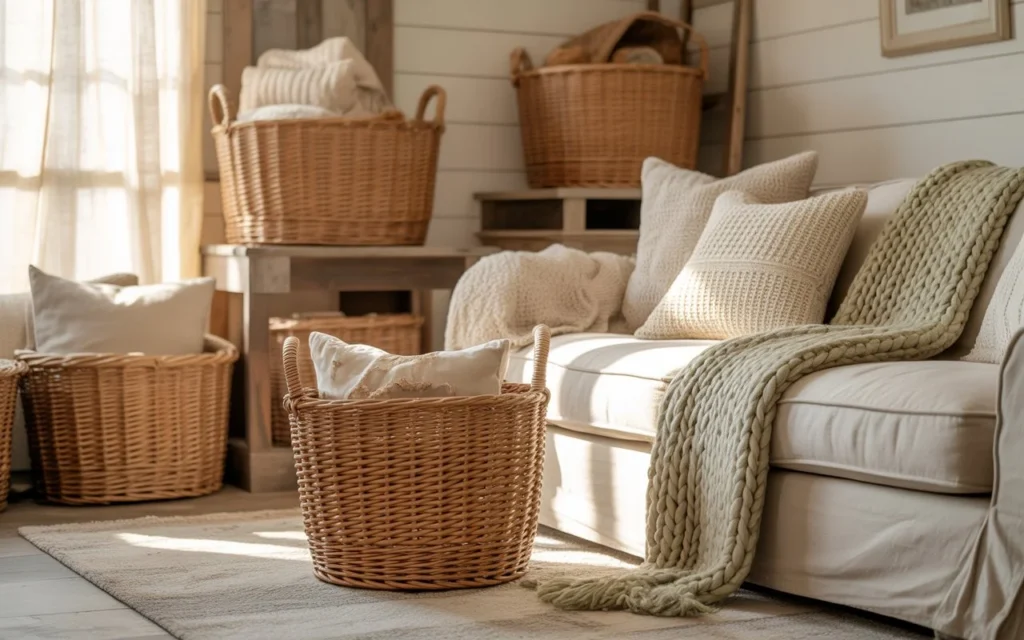 Clutter is one of the biggest obstacles to achieving a clean farmhouse look. Woven baskets provide a stylish storage solution while adding texture and warmth to your space.