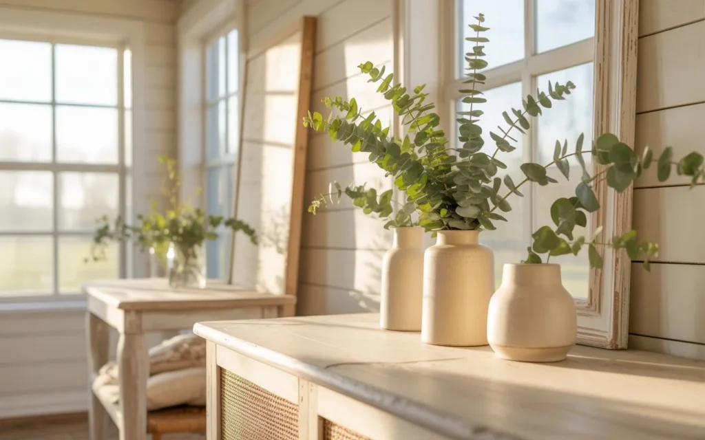 If your home feels dull or lifeless, adding greenery is a game changer. Plants like ferns, olive branches, or eucalyptus bring life and freshness into your space while maintaining a soft farmhouse vibe.