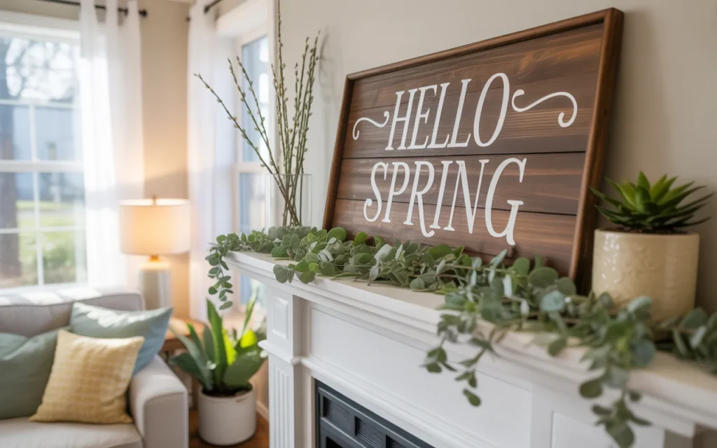 Adding a spring-themed sign or quote can make your mantel feel more personal and seasonal. Look for phrases like “Hello Spring” or “Bloom & Grow.”