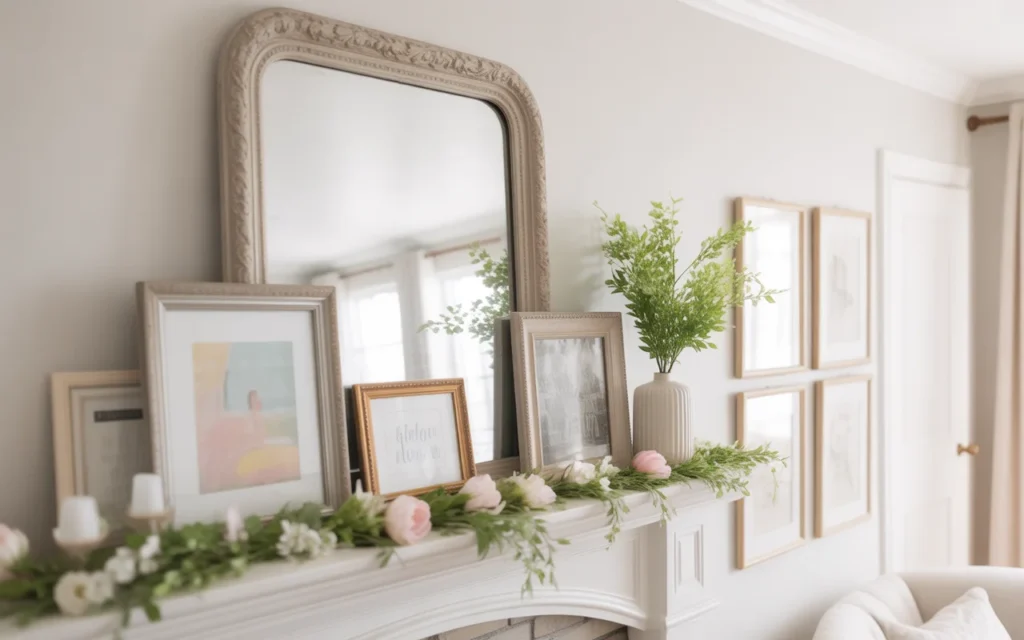 Choose soft spring-themed prints like florals, botanical sketches, or pastel abstract art. This setup works beautifully for those looking for minimalist spring mantel styling ideas while still adding visual interest without clutter.