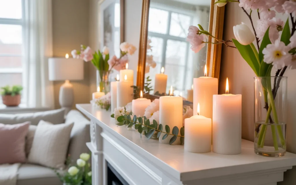 Candles aren’t just for winter—they can also create a cozy yet fresh spring atmosphere. Use white or pastel-colored candles in varying heights to add dimension to your mantel.