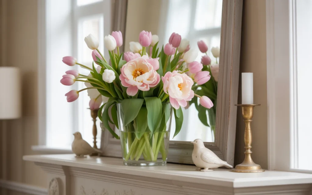 Use a statement vase in the center or create symmetry with smaller arrangements on both sides. This idea is perfect for those searching for easyspring mantel decor with flowers that feels vibrant yet elegant.