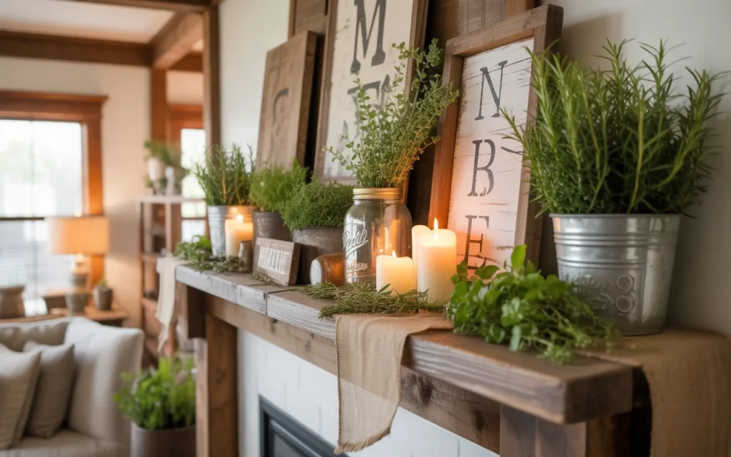 Pair wood with greenery or soft fabrics to create a harmonious look. This approach is ideal for those interested in farmhouse spring mantel decor ideas that feel cozy and inviting.
