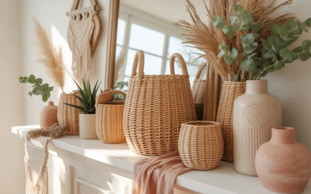 Adding texture is essential for a Pinterest-worthy mantel. Small woven baskets, rattan decor, or textured pots can make your setup feel layered and interesting.